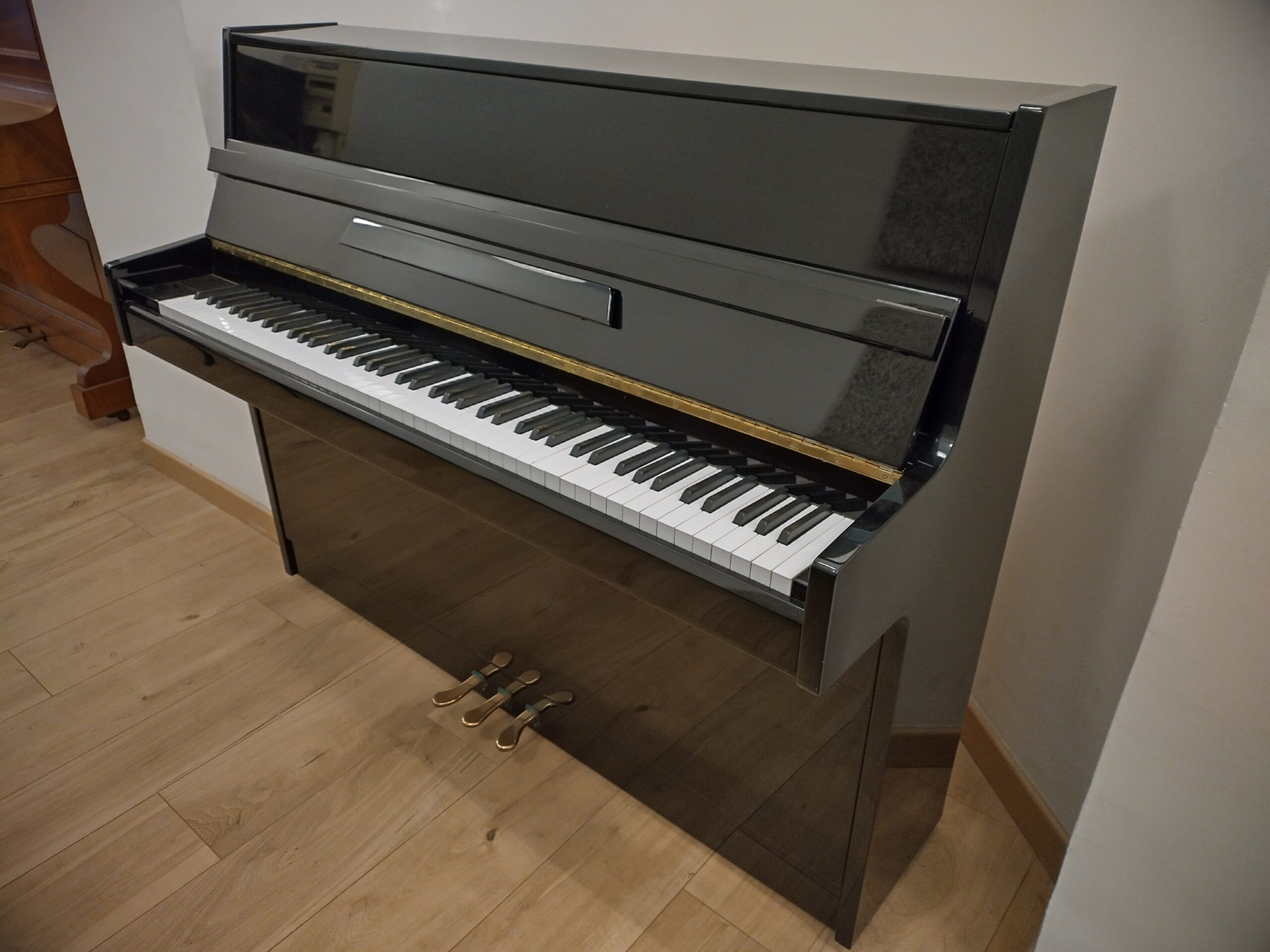 Ce piano droit fabriqué en Italie avec des matériaux de qualité permet de débuter ( et même de continuer !) la pratique piano avec plaisir sans se ruiner et avec style. Cet instrument est aussi particulièrement compact et connivent à merveille à de petites pièces. Il est équipé d’une sourdine .